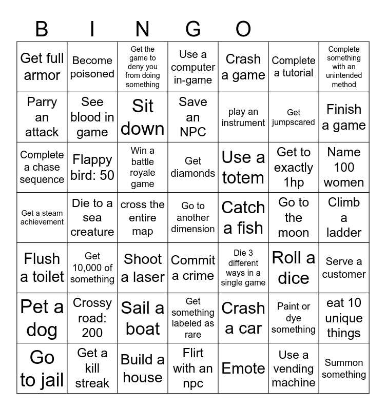 This bingo card has a free space and 48 words: Crash a car, Get jumpscared, Flirt with an npc, Die to a sea creature, Win a battle royale game, Climb a ladder, Become poisoned, Get a kill streak, Complete a tutorial, Commit a crime, Complete something with an unintended method, Use a computer in-game, Get to exactly 1hp, Use a totem, Pet a dog, Go to the moon, Parry an attack, Finish a game, Paint or dye something, Crash a game, play an instrument, cross the entire map, Get full armor, See blood in game, eat 10 unique things, Sit down, Name 100 women, Go to jail, Get diamonds, Flappy bird: 50, Use a vending machine, Catch a fish, Serve a customer, Crossy road: 200, Get a steam achievement, Die 3 different ways in a single game, Roll a dice, Complete a chase sequence, Shoot a laser, Sail a boat, Flush a toilet, Summon something, Get the game to deny you from doing something, Build a house, Save an NPC, Get something labeled as rare, Get 10,000 of something and Emote.