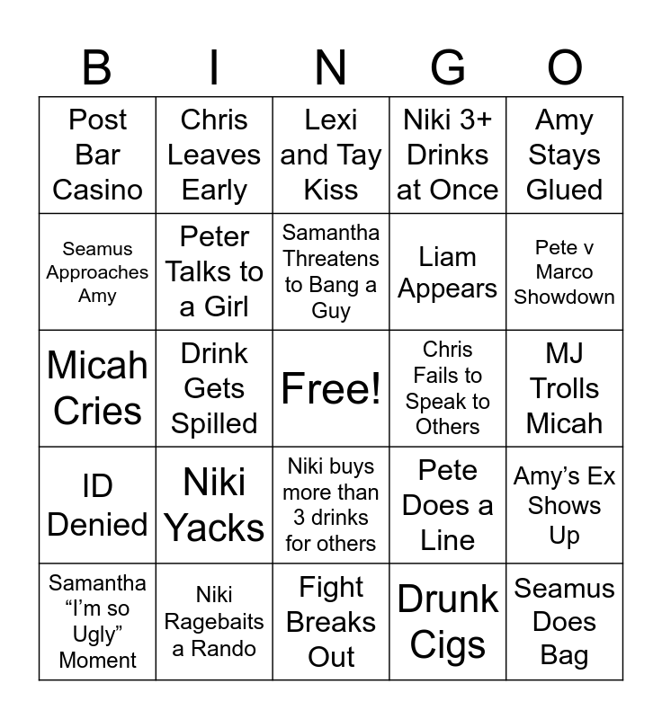 This bingo card has a free space and 25 words: Niki Yacks, Fight Breaks Out, Samantha Threatens to Bang a Guy, Samantha “I’m so Ugly” Moment, Amy Stays Glued, Post Bar Casino, Seamus Approaches Amy, Chris Leaves Early, Chris Fails to Speak to Others, Niki buys more than 3 drinks for others, Liam Appears, Micah Cries, Pete Does a Line, Amy’s Ex Shows Up, Peter Talks to a Girl, Someone Blacks Out, MJ Trolls Micah, Lexi and Tay Kiss, Pete v Marco Showdown, Drink Gets Spilled, Seamus Does Bag, Niki Ragebaits a Rando, ID Denied, Niki 3+ Drinks at Once and Drunk Cigs.