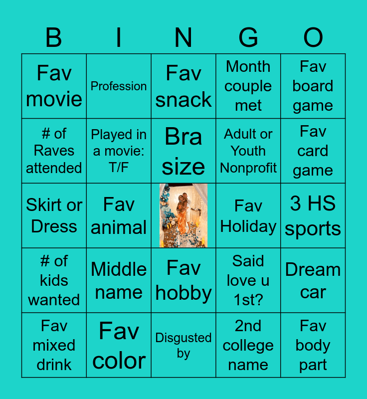 This bingo card has a free space and 24 words: Middle name, Fav color, Bra size, Fav mixed drink, Fav board game, Fav movie, # of Raves attended, Profession, Fav Holiday, Fav hobby, Adult or Youth Nonprofit, Skirt or Dress, Said love u 1st?, Dream car, Played in a movie: T/F, 2nd college name, 3 HS sports, Fav snack, Fav card game, Fav animal, Fav body part, # of kids wanted, Month couple met and Disgusted by.