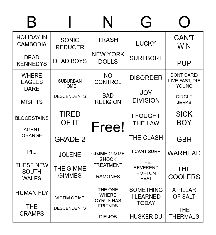 This bingo card has a free space and 24 words: JOLENE THE GIMME GIMMES, VICTIM OF ME DESCENDENTS, NO CONTROL BAD RELIGION, HUMAN FLY THE CRAMPS, CAN'T WIN PUP, HOLIDAY IN CAMBODIA DEAD KENNEDYS, WHERE EAGLES DARE MISFITS, SONIC REDUCER DEAD BOYS, I FOUGHT THE LAW THE CLASH, GIMME GIMME SHOCK TREATMENT RAMONES, DISORDER JOY DIVISION, BLOODSTAINS AGENT ORANGE, I CANT SURF THE REVEREND HORTON HEAT, WARHEAD THE COOLERS, SUBURBAN HOME DESCENDENTS, SOMETHING I LEARNED TODAY HUSKER DU, SICK BOY GBH, TRASH NEW YORK DOLLS, DONT CARE/ LIVE FAST, DIE YOUNG CIRCLE JERKS, TIRED OF IT GRADE 2, A PILLAR OF SALT THE THERMALS, PIG THESE NEW SOUTH WALES, LUCKY SURFBORT and THE ONE WHERE CYRUS HAS FRIENDS DIE JOB.