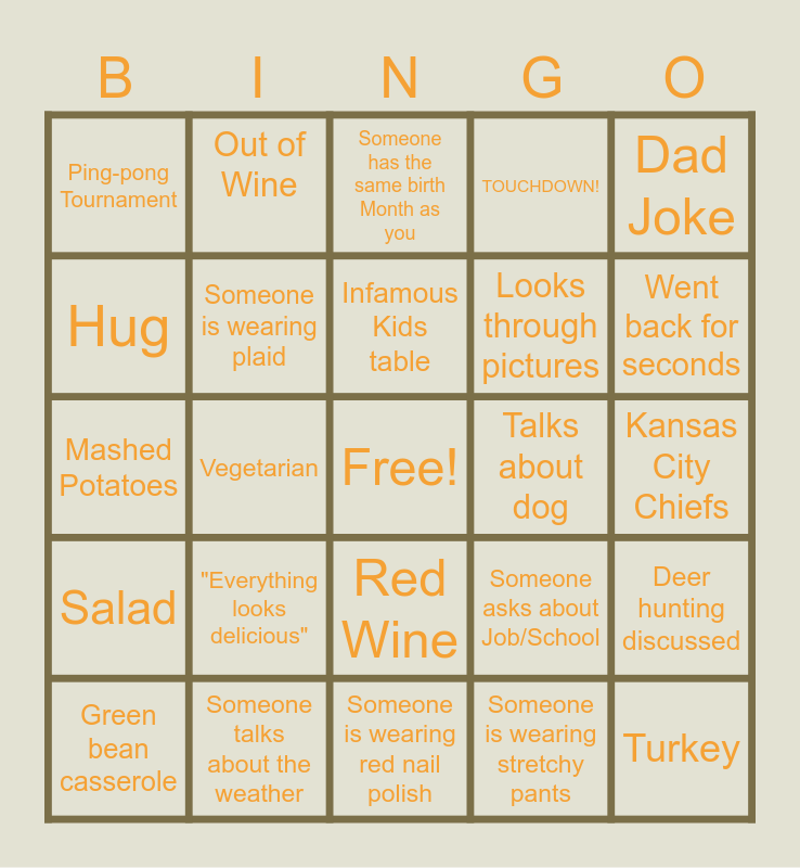 This bingo card has a free space and 49 words: "Chim Chim", Turkey, Pumpkin Roll, Someone is wearing red nail polish, "Everything looks delicious", "Marie made the turkey", Out of Wine, Tea, Hug, "Remember when...", Someone is wearing plaid, TOUCHDOWN!, Deer hunting discussed, Someone asks about Job/School, Christmas is Mentioned, Talks about sports, Infamous Kids table, Talks about dog, Someone is late, Dad Joke, Vegetarian, Someone is wearing stretchy pants, Ping-pong Tournament, Looks through pictures, Corn, Went back for seconds, Green bean casserole, White wine, Red Wine, Salad, Thankful for..., Football, Movie Quote, Lottery Ticket, Someone talks about the weather, Smiles :), Lemonade, Prayer, Kansas City Chiefs, Someone talks about their dog, Someone is wearing an apron, "How cute", Beer, Dinner Rolls, Mashed Potatoes, Someone has the same birth Month as you, "I'm so full", "I'm so sleepy" and "I'm thankful for...".