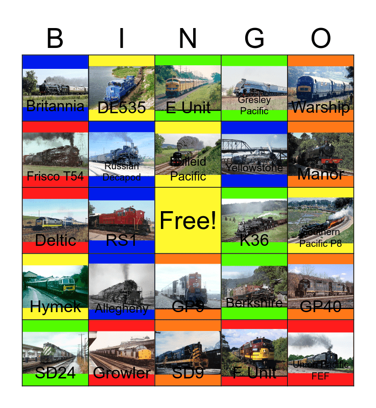 This bingo card has 24 images, a free space and 24 words: Allegheny, Growler, Bulleid Pacific, SD24, Warship, Britannia, Frisco T54, DL535, K36, GP9, Yellowstone, Deltic, Berkshire, GP40, Russian Decapod, F Unit, Southern Pacific P8, E Unit, Manor, RS1, Union Pacific FEF, Hymek, Gresley Pacific and SD9.