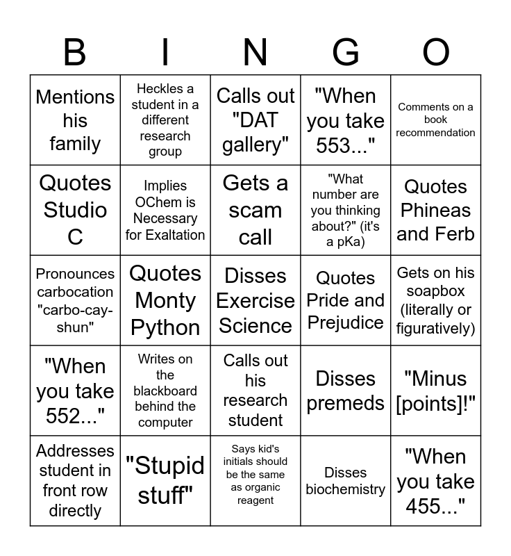 This bingo card has a free space and 24 words: Writes on the blackboard behind the computer, "Stupid stuff", Gets a scam call, Addresses student in front row directly, Comments on a book recommendation, Mentions his family, Quotes Studio C, Heckles a student in a different research group, Quotes Pride and Prejudice, Calls out his research student, "What number are you thinking about?" (it's a pKa), Pronounces carbocation "carbo-cay-shun", Disses premeds, "Minus [points]!", Implies OChem is Necessary for Exaltation, Disses biochemistry, Gets on his soapbox (literally or figuratively), Calls out "DAT gallery", Quotes Phineas and Ferb, Quotes Monty Python, "When you take 455...", "When you take 552...", "When you take 553..." and Says kid's initials should be the same as organic reagent.