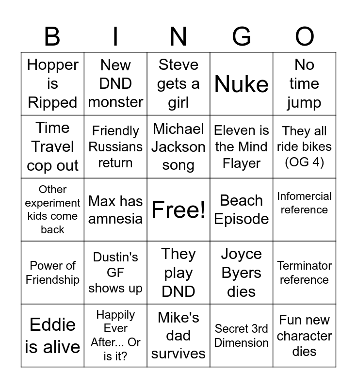 This bingo card has a free space and 24 words: Eddie is alive, Dustin's GF shows up, Michael Jackson song, Secret 3rd Dimension, No time jump, Hopper is Ripped, New DND monster, Steve gets a girl, Beach Episode, Infomercial reference, Other experiment kids come back, Friendly Russians return, Joyce Byers dies, Terminator reference, Time Travel cop out, Happily Ever After... Or is it?, Mike's dad survives, Nuke, They all ride bikes (OG 4), Power of Friendship, Max has amnesia, They play DND, Eleven is the Mind Flayer and Fun new character dies.