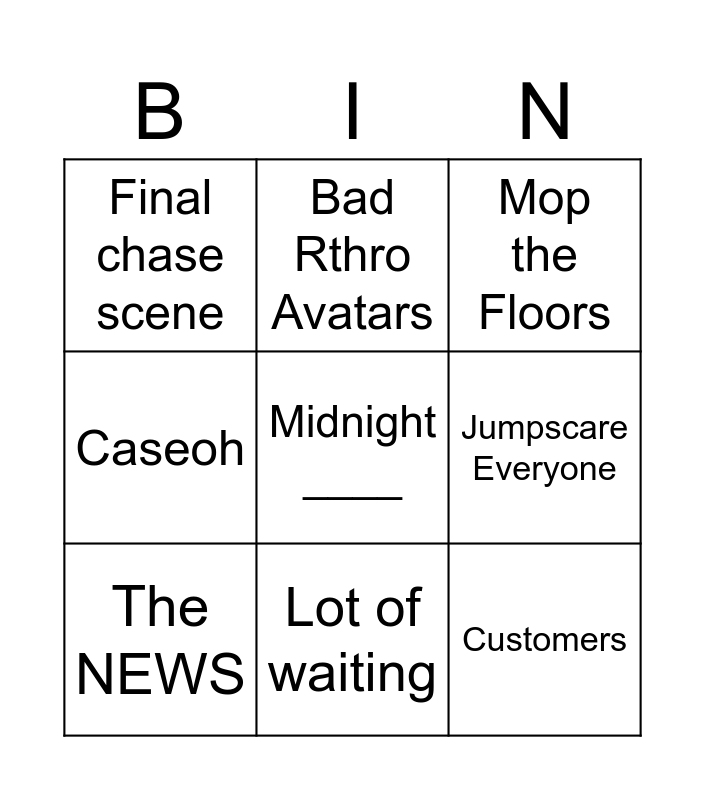 This bingo card has a free space and 8 words: Jumpscare Everyone, Mop the Floors, Bad Rthro Avatars, The NEWS, Final chase scene, Customers, Caseoh and Lot of waiting.