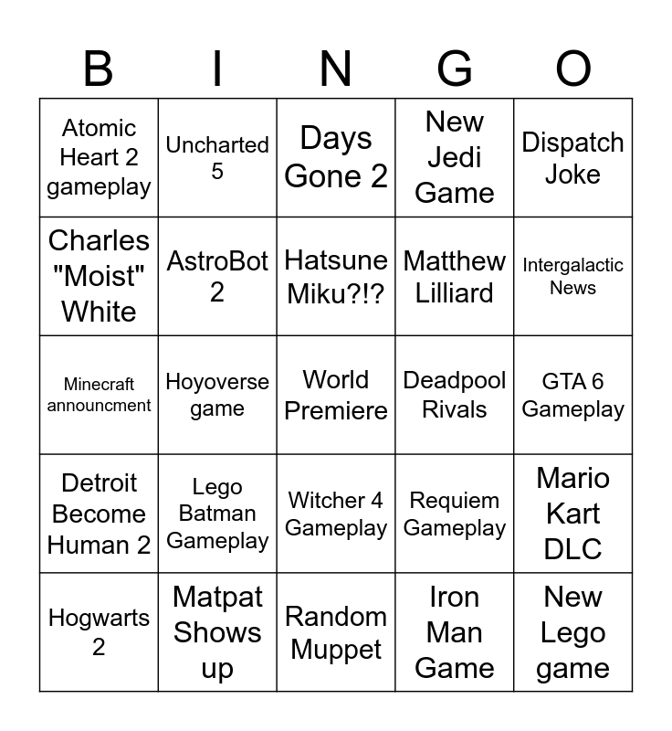 This bingo card has a free space and 24 words: Lego Batman Gameplay, Matpat Shows up, Hatsune Miku?!?, Hogwarts 2, Dispatch Joke, Atomic Heart 2 gameplay, Charles "Moist" White, Uncharted 5, Deadpool Rivals, Witcher 4 Gameplay, Matthew Lilliard, Minecraft announcment, Requiem Gameplay, Mario Kart DLC, AstroBot 2, Iron Man Game, GTA 6 Gameplay, Days Gone 2, Intergalactic News, Hoyoverse game, New Lego game, Detroit Become Human 2, New Jedi Game and Random Muppet.