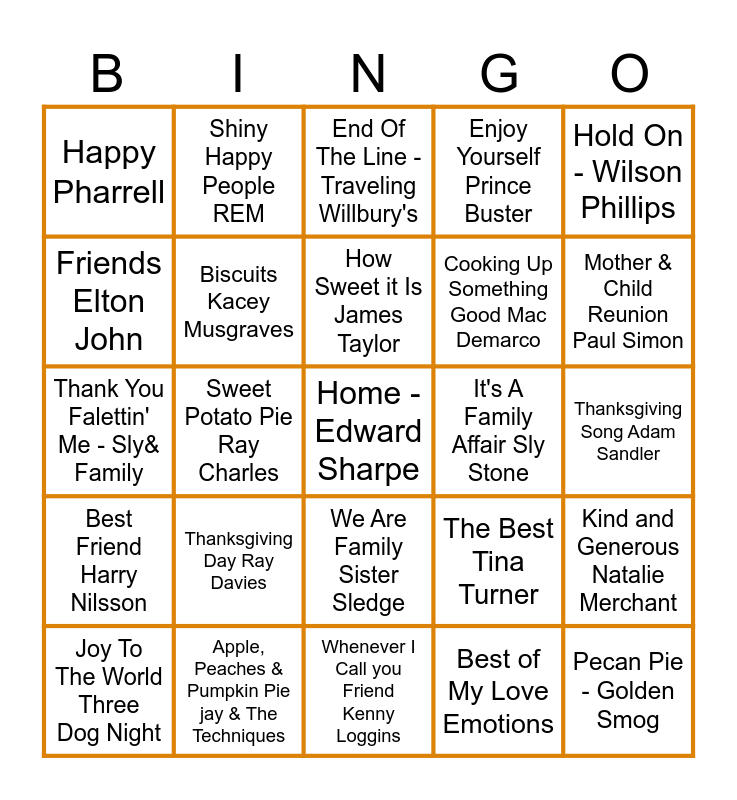 This bingo card has 60 words: Alice's Restaurant Arlo Guthrie, Apple, Peaches & Pumpkin Pie jay & The Techniques, Be Thankful Natalie Cole, Best Friend Harry Nilsson, Best of My Love Emotions, Better Together Jack Johnson, Biscuits Kacey Musgraves, Celebration Kool & The Gang, Cooking Up Something Good Mac Demarco, Don't Worry Be Happy Bobby McFerrin, Enjoy Yourself Prince Buster, Family Affair Mary J. Blige, Friends Elton John, Friends in Low Places Garth Brooks, Good Times Chic, Happy Pharrell, Home - Edward Sharpe, Hold On - Wilson Phillips, Homeward Bound Simon & Garfunkle, How Sweet it Is James Taylor, It's A Family Affair Sly Stone, End Of The Line - Traveling Willbury's, Joy To The World Three Dog Night, Kind and Generous Natalie Merchant, Love Train The O'Jays, Macy's Day Parade Green Day, Make Someone Happy Jimmy Durante, Mashed Potato Time Dee Dee Sharp, Mother & Child Reunion Paul Simon, Oh Happy Day Edwin Hawkins, Peace Train Cat Stevens, Peanuts Thanksgiving Vince Guaraldi, Praise You Fatboy Slim, Put On A Happy Face Tony Bennett, Shiny Happy People REM, Smile Uncle Cracker, Stand By Me Ben E King, Sweet Potato Pie Ray Charles, Thank You Boyz II Men, Thank You Falettin' Me - Sly& Family, Thank You for Being A Friend Andrew Gold, Thanksgiving Day Ray Davies, Thanksgiving Song Adam Sandler, That's What Friends Are For Dionne Warwick, The Best Tina Turner, The Bird Morris Day, The Happy Organ Dave Baby Cortez, Those Were The Days Mary Hopkins, Turkey Trot Little Eva, We Are Family Sister Sledge, Whenever I Call you Friend Kenny Loggins, Why Can't We Be Friends War, With a Little Help From My Friends Joe Cocker, Kitchen With Dinah - Mercer, You're My Best Friend Queen, You're Welcome Dwayne Johnson, Cherry Pie - Warrant, American Pie - Don McLane, Pecan Pie - Golden Smog and Hey Good Lookin' - Hank Williams.