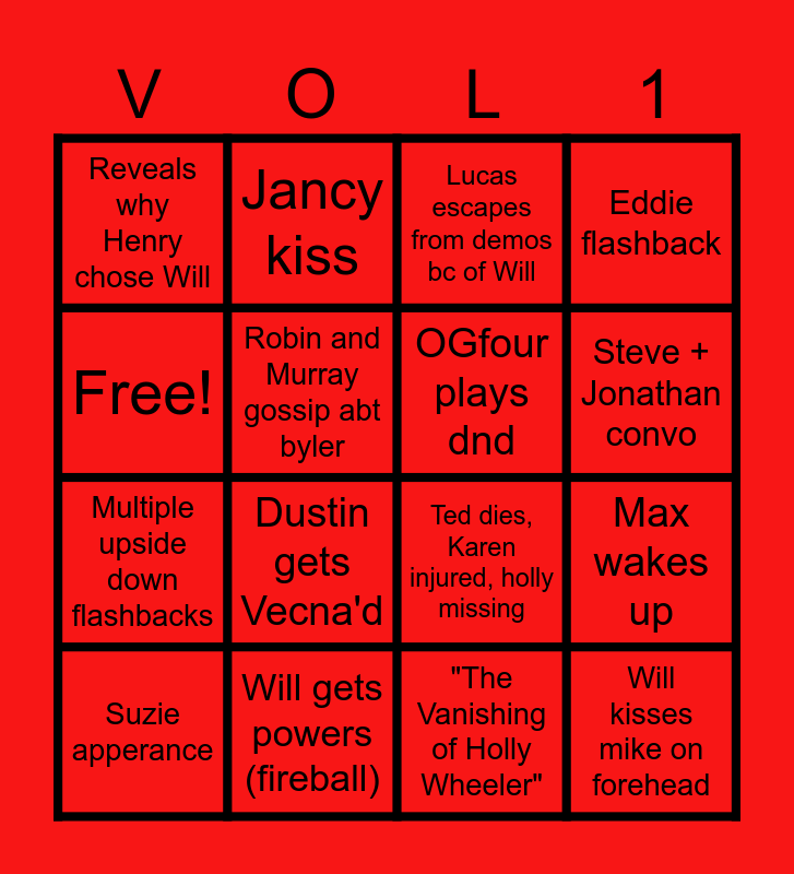 This bingo card has 16 words: Will gets powers (fireball), Max wakes up, Lucas escapes from demos bc of Will, Reveals why Henry chose Will, Multiple upside down flashbacks, Jancy kiss, Ted dies, Karen injured, holly missing, "The Vanishing of Holly Wheeler", Free!, Robin and Murray gossip abt byler, Suzie apperance, Eddie flashback, Dustin gets Vecna'd, Steve + Jonathan convo, OGfour plays dnd and Will kisses mike on forehead.