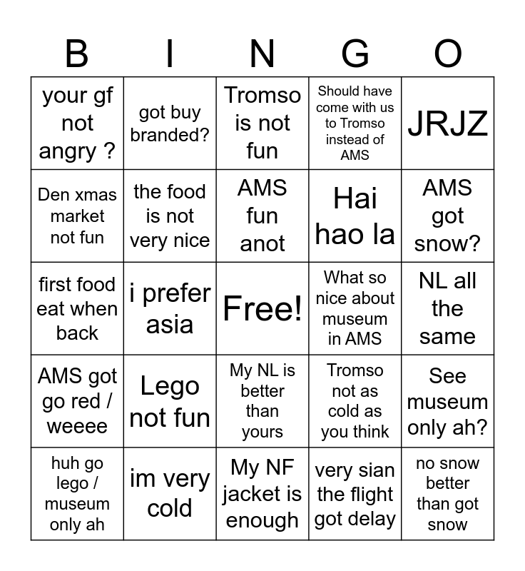 This bingo card has a free space and 24 words: huh go lego / museum only ah, Lego not fun, AMS fun anot, very sian the flight got delay, JRJZ, your gf not angry ?, got buy branded?, Tromso is not fun, What so nice about museum in AMS, NL all the same, first food eat when back, the food is not very nice, Tromso not as cold as you think, See museum only ah?, Den xmas market not fun, im very cold, My NF jacket is enough, Should have come with us to Tromso instead of AMS, AMS got snow?, AMS got go red / weeee, i prefer asia, My NL is better than yours, Hai hao la and no snow better than got snow.