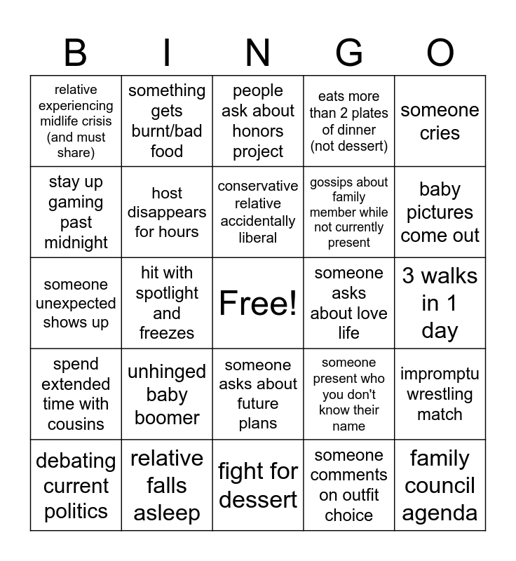This bingo card has a free space and 24 words: unhinged baby boomer, relative falls asleep, conservative relative accidentally liberal, debating current politics, someone cries, relative experiencing midlife crisis (and must share), stay up gaming past midnight, something gets burnt/bad food, someone asks about love life, someone asks about future plans, gossips about family member while not currently present, someone unexpected shows up, someone present who you don't know their name, impromptu wrestling match, host disappears for hours, someone comments on outfit choice, 3 walks in 1 day, people ask about honors project, baby pictures come out, hit with spotlight and freezes, family council agenda, spend extended time with cousins, eats more than 2 plates of dinner (not dessert) and fight for dessert.