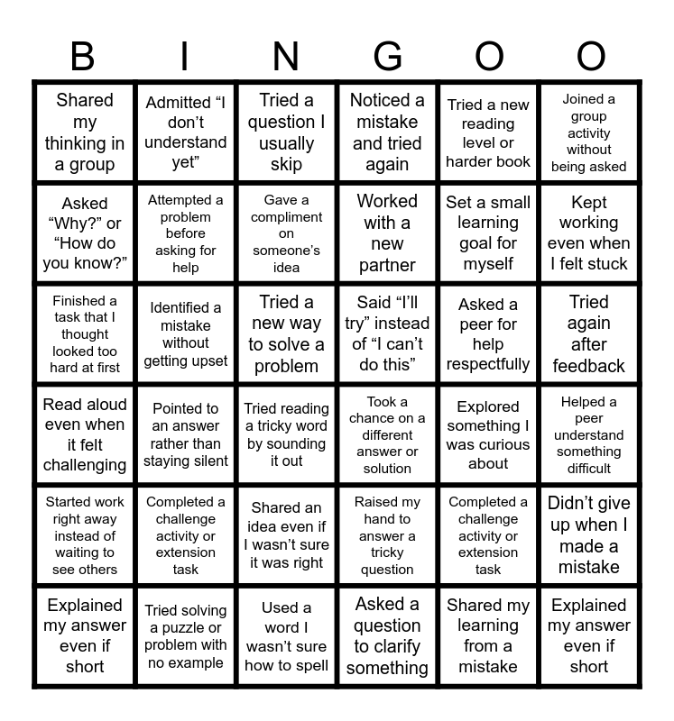 This bingo card has 36 words: Raised my hand to answer a tricky question, Shared an idea even if I wasn’t sure it was right, Asked a question to clarify something, Asked “Why?” or “How do you know?”, Read aloud even when it felt challenging, Said “I’ll try” instead of “I can’t do this”, Attempted a problem before asking for help, Used a word I wasn’t sure how to spell, Tried a new reading level or harder book, Completed a challenge activity or extension task, Kept working even when I felt stuck, Noticed a mistake and tried again, Didn’t give up when I made a mistake, Identified a mistake without getting upset, Worked with a new partner, Shared my thinking in a group, Started work right away instead of waiting to see others, Asked a peer for help respectfully, Finished a task that I thought looked too hard at first, Tried a question I usually skip, Tried a new way to solve a problem, Pointed to an answer rather than staying silent, Took a chance on a different answer or solution, Tried reading a tricky word by sounding it out, Explored something I was curious about, Admitted “I don’t understand yet”, Set a small learning goal for myself, Tried solving a puzzle or problem with no example, Gave a compliment on someone’s idea, Joined a group activity without being asked, Explained my answer even if short, Explained my answer even if short, Helped a peer understand something difficult, Tried again after feedback, Completed a challenge activity or extension task and Shared my learning from a mistake.