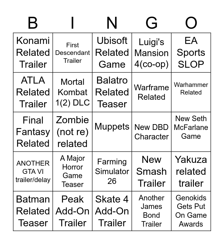 This bingo card has a free space and 24 words: A Major Horror Game Teaser, Peak Add-On Trailer, Balatro Related Teaser, Batman Related Teaser, EA Sports SLOP, Konami Related Trailer, ATLA Related Trailer, First Descendant Trailer, New DBD Character, Farming Simulator 26, Warframe Related, Final Fantasy Related, New Smash Trailer, Yakuza related trailer, Mortal Kombat 1(2) DLC, Another James Bond Trailer, New Seth McFarlane Game, Ubisoft Related Game, Warhammer Related, Zombie (not re) related, Genokids Gets Put On Game Awards, ANOTHER GTA VI trailer/delay, Luigi's Mansion 4(co-op) and Skate 4 Add-On Trailer.