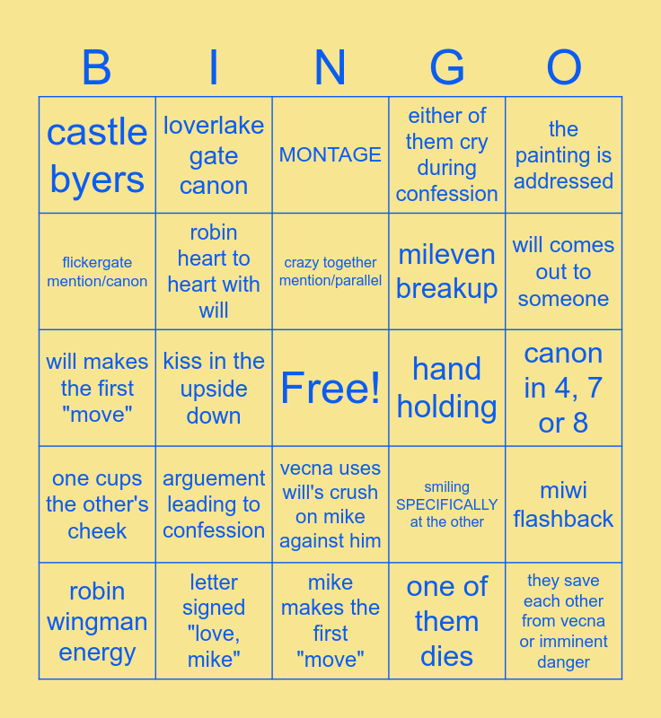 This bingo card has a free space and 24 words: arguement leading to confession, letter signed "love, mike", crazy together mention/parallel, robin wingman energy, the painting is addressed, castle byers, flickergate mention/canon, loverlake gate canon, hand holding, vecna uses will's crush on mike against him, mileven breakup, will makes the first "move", smiling SPECIFICALLY at the other, miwi flashback, robin heart to heart with will, one of them dies, canon in 4, 7 or 8, MONTAGE, will comes out to someone, kiss in the upside down, they save each other from vecna or imminent danger, one cups the other's cheek, either of them cry during confession and mike makes the first "move".