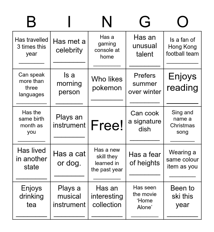 This bingo card has a free space and 24 words: Has a cat or dog. _______, Plays a musical instrument ________, Who likes pokemon ________, Enjoys drinking tea ________, Is a fan of Hong Kong football team __________, Has travelled 3 times this year ________, Can speak more than three languages __________, Has met a celebrity ________, Can cook a signature dish ________, Has a new skill they learned in the past year _________, Prefers summer over winter ________, Has the same birth month as you _________, Has a fear of heights ________, Wearing a same colour item as you ________, Is a morning person _______, Has seen the movie ‘Home Alone’ _________, Sing and name a Christmas song ________, Has a gaming console at home _________, Enjoys reading ______, Plays an instrument ________, Been to ski this year ________, Has lived in another state ________, Has an unusual talent ________ and Has an interesting collection ________.