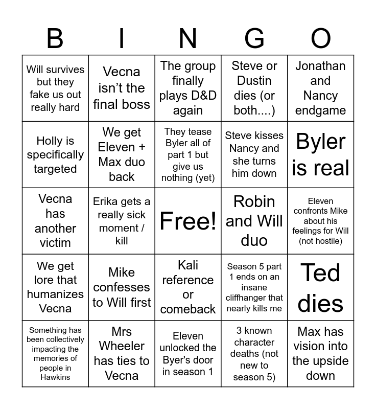 This bingo card has a free space and 24 words: Mike confesses to Will first, Mrs Wheeler has ties to Vecna, They tease Byler all of part 1 but give us nothing (yet), Something has been collectively impacting the memories of people in Hawkins, Jonathan and Nancy endgame, Will survives but they fake us out really hard, Holly is specifically targeted, Vecna isn’t the final boss, Robin and Will duo, Kali reference or comeback, Steve kisses Nancy and she turns him down, Vecna has another victim, Season 5 part 1 ends on an insane cliffhanger that nearly kills me, Ted dies, We get Eleven + Max duo back, 3 known character deaths (not new to season 5), Eleven confronts Mike about his feelings for Will (not hostile), The group finally plays D&D again, Byler is real, Erika gets a really sick moment / kill, Max has vision into the upside down, We get lore that humanizes Vecna, Steve or Dustin dies (or both....) and Eleven unlocked the Byer's door in season 1.