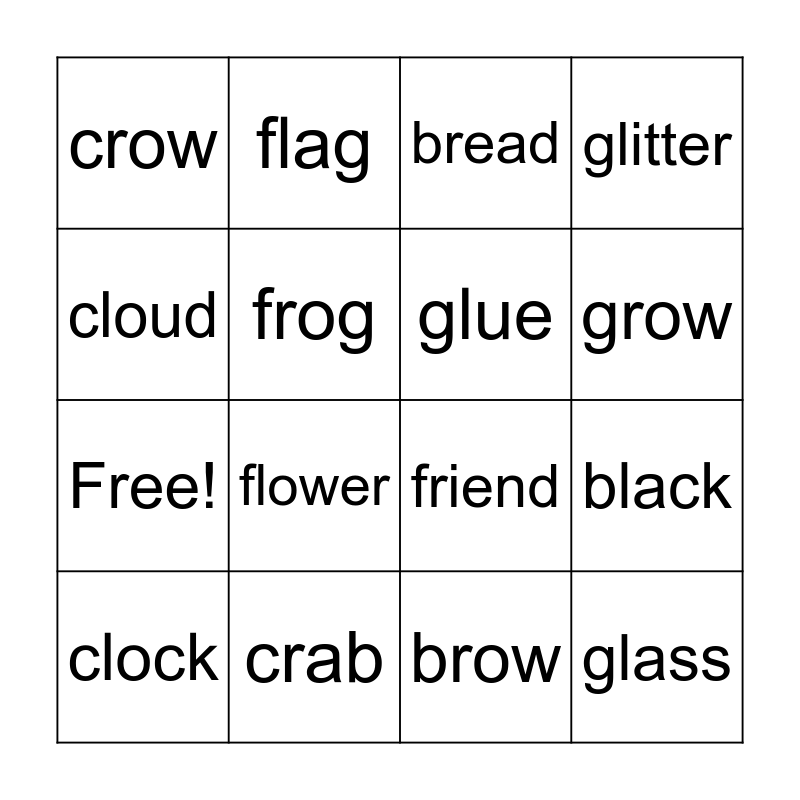 This bingo card has 20 words: black, block, bread, brush, clock, cloud, crab, crow, Free!, flag, flower, friend, frog, glass, glue, great, grow, glitter, brow and crown.