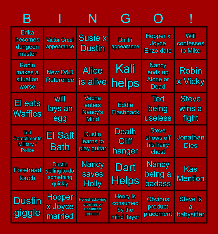 This bingo card has 42 words: Obvious product placement, New D&D Reference, El sacrifices Will in the beginning, Ted being useless, Jonathan Dies, El Salt Bath, El eats Waffles, "Friends Don't Lie", Susie x Dustin, Steve wins a fight, Vecna enters Nancy's Mind, Kali helps, Robin x Vicky, Hopper x Joyce Enzo date, Hopper x Joyce married, Ted Compliments Military / Police, Kas Mention, Nancy ends up Alone or Dead, Steve is a babysitter, Victor Creel appearance, Will confesses to Mike, Nancy saves Holly, Forehead touch, Erika becomes dungeon master, New Monster, Dustin giggle, Alice is alive, El develops new power, Dustin yelling to do something quickly, Nancy being a badass, Max x Lucas movie date, Eddie Flashback, Robin makes a situation worse, Steve shows off his hairy chest, Foreshadowing promise or unfulfilled promise, Dustin learns to play guitar, Death Cliff hanger, will lays an egg, Dart Helps, Henry is consumed by the mind flayer, Dmitri appearance and Max can see again.