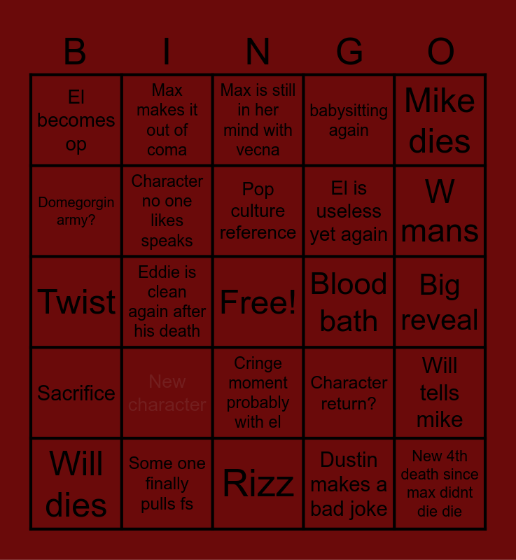 This bingo card has a free space and 24 words: Will dies, New character, Pop culture reference, Dustin makes a bad joke, Mike dies, El becomes op, Max makes it out of coma, Max is still in her mind with vecna, Blood bath, Big reveal, Twist, Character no one likes speaks, Character return?, Will tells mike, Domegorgin army?, Some one finally pulls fs, Rizz, babysitting again, W mans, Sacrifice, Eddie is clean again after his death, Cringe moment probably with el, El is useless yet again and New 4th death since max didnt die die.