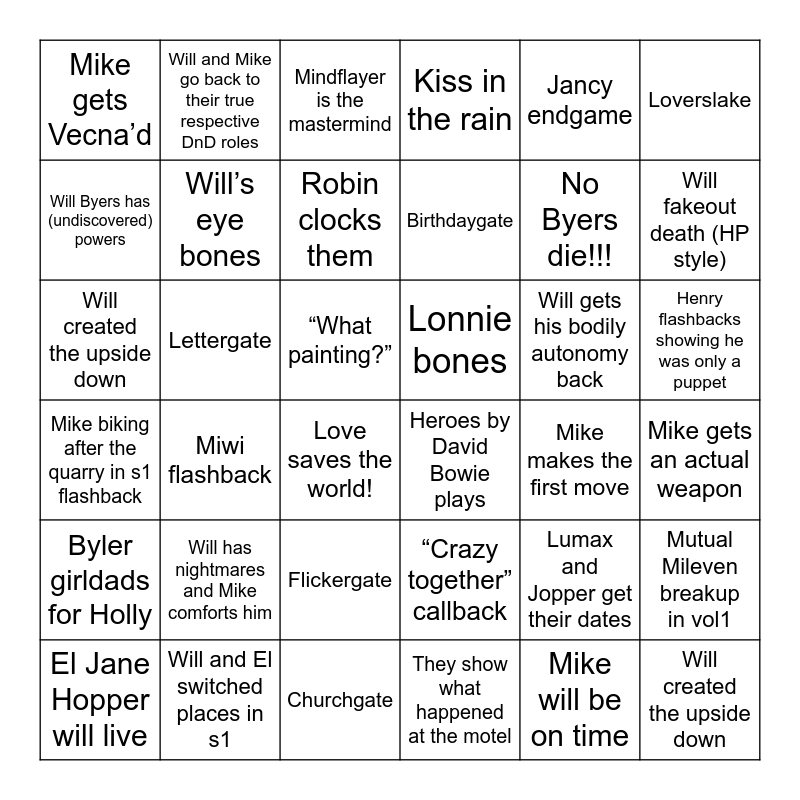 This bingo card has 36 words: “Crazy together” callback, Flickergate, They show what happened at the motel, Will Byers has (undiscovered) powers, Mike biking after the quarry in s1 flashback, Lonnie bones, Will’s eye bones, Churchgate, Jancy endgame, Lumax and Jopper get their dates, Will fakeout death (HP style), Kiss in the rain, Mutual Mileven breakup in vol1, Lettergate, Birthdaygate, Mike gets Vecna’d, Byler girldads for Holly, Will gets his bodily autonomy back, Will created the upside down, Mindflayer is the mastermind, “What painting?”, Miwi flashback, Heroes by David Bowie plays, Love saves the world!, Mike makes the first move, Will and Mike go back to their true respective DnD roles, No Byers die!!!, Will and El switched places in s1, Robin clocks them, Loverslake, Will created the upside down, El Jane Hopper will live, Mike gets an actual weapon, Henry flashbacks showing he was only a puppet, Will has nightmares and Mike comforts him and Mike will be on time.