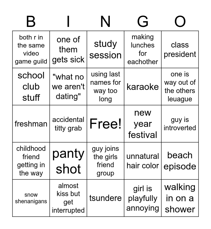 This bingo card has a free space and 24 words: panty shot, almost kiss but get interrupted, using last names for way too long, snow shenanigans, class president, both r in the same video game guild, school club stuff, one of them gets sick, new year festival, guy joins the girls friend group, karaoke, freshman, unnatural hair color, beach episode, "what no we aren't dating", girl is playfully annoying, guy is introverted, study session, one is way out of the others leuague, accidental titty grab, walking in on a shower, childhood friend getting in the way, making lunches for eachother and tsundere.