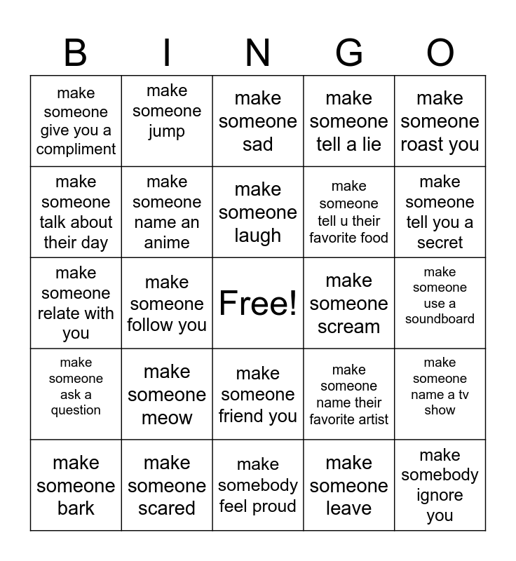 This bingo card has a free space and 24 words: make someone bark, make someone meow, make someone laugh, make someone leave, make someone roast you, make someone give you a compliment, make someone jump, make someone sad, make someone scream, make someone use a soundboard, make someone relate with you, make someone name an anime, make someone name their favorite artist, make someone name a tv show, make someone talk about their day, make someone scared, make somebody feel proud, make someone tell a lie, make someone tell you a secret, make someone ask a question, make someone follow you, make someone friend you, make someone tell u their favorite food and make somebody ignore you.