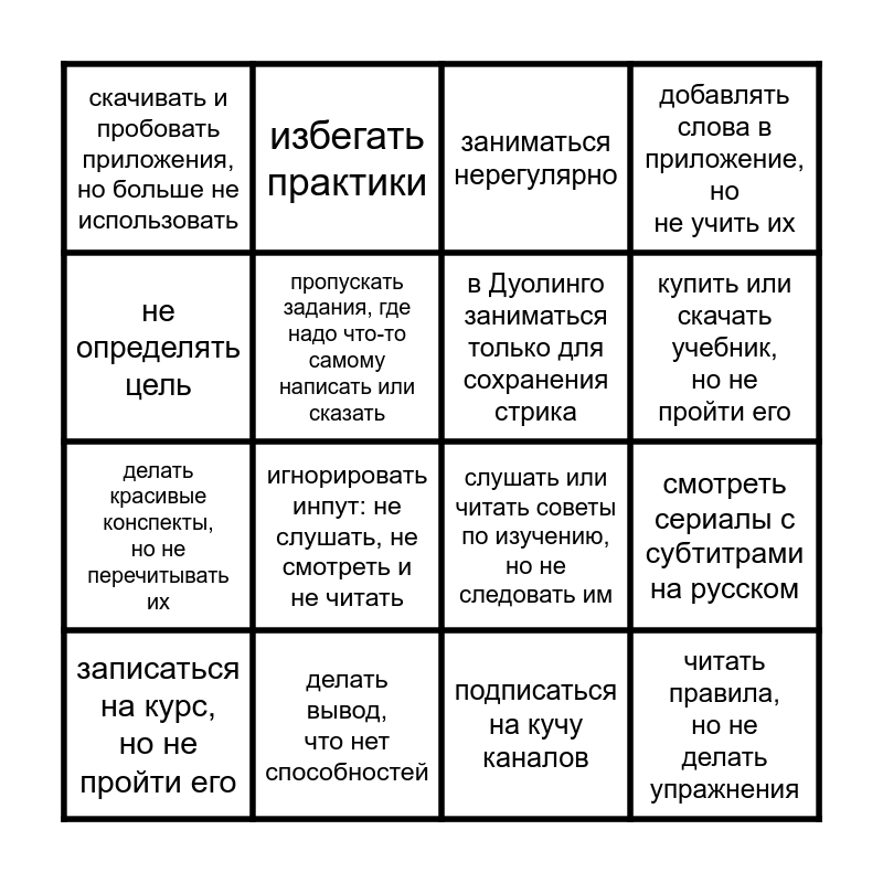 This bingo card has 16 words: записаться на курс, но не пройти его, делать вывод, что нет способностей, заниматься нерегулярно, добавлять слова в приложение, но не учить их, не определять цель, избегать практики, слушать или читать советы по изучению, но не следовать им, смотреть сериалы с субтитрами на русском, скачивать и пробовать приложения, но больше не использовать, пропускать задания, где надо что-то самому написать или сказать, подписаться на кучу каналов, купить или скачать учебник, но не пройти его, делать красивые конспекты, но не перечитывать их, игнорировать инпут: не слушать, не смотреть и не читать, в Дуолинго заниматься только для сохранения стрика and читать правила, но не делать упражнения.