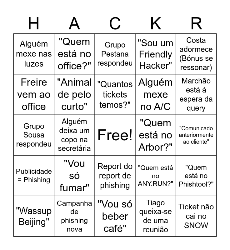 This bingo card has a free space and 46 words: Marchão fala de THM, Ticket não cai no SNOW, "Devia enviar email?", "Vou só beber café", "Vou só fumar", "Como querem fazer com o almoço?", "Quem está no office?", "Quem está remote?", Freire vem ao office, Joana foi para o SIRESP, "Animal de pelo curto", "Sou um Friendly Hacker", "Quem está no Phishtool?", "Quem está no ANY.RUN?", "Faz a passagem de turno", "Está tudo a arder 🔥", "Quantos tickets temos?", "Quem está no Arbor?", Reunião semanal é adiada, Costa adormece (Bónus se ressonar), Alguém deixa um copo na secretária, Tiago queixa-se de uma reunião, Alguém mexe nas luzes, Alguém mexe no A/C, Bruno avisa de ataque (Bónus se projeto), Marchão está à espera da query, "Wassup Beijing", Engenharia manda ticket (Bónus se falso positivo), Report do report de phishing, Publicidade = Phishing, Red faz pentest, Cliente é estúpido, DDoS verdadeiro, Updates da Microsoft, Update força restart, Campanha de phishing nova, "Comunicado anteriormente ao cliente", Engenharia faz merda, "Mitra reviews MITRE", Slow7, Marchão critica ex-N2, Grupo Pestana respondeu, Grupo Sousa respondeu, Media Capital responde aos tickets, NOS faz forward para o BNIE and Chamam ao Vitor de "Bruno".