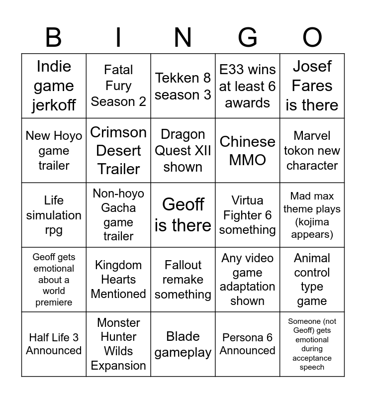 This bingo card has a free space and 24 words: Kingdom Hearts Mentioned, Monster Hunter Wilds Expansion, Dragon Quest XII shown, Half Life 3 Announced, Josef Fares is there, Indie game jerkoff, New Hoyo game trailer, Fatal Fury Season 2, Virtua Fighter 6 something, Fallout remake something, Chinese MMO, Life simulation rpg, Any video game adaptation shown, Animal control type game, Crimson Desert Trailer, Persona 6 Announced, Mad max theme plays (kojima appears), Tekken 8 season 3, Marvel tokon new character, Non-hoyo Gacha game trailer, Someone (not Geoff) gets emotional during acceptance speech, Geoff gets emotional about a world premiere, E33 wins at least 6 awards and Blade gameplay.