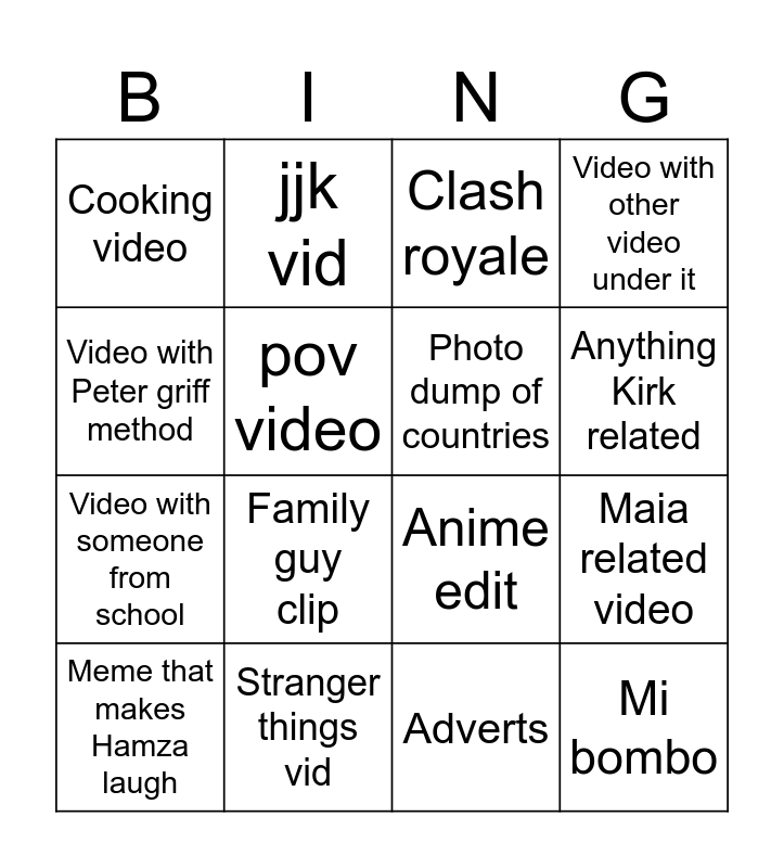 This bingo card has 16 words: Stranger things vid, Maia related video, Clash royale, Cooking video, Video with someone from school, jjk vid, Anime edit, Adverts, Video with Peter griff method, pov video, Meme that makes Hamza laugh, Video with other video under it, Family guy clip, Anything Kirk related, Photo dump of countries and Mi bombo.