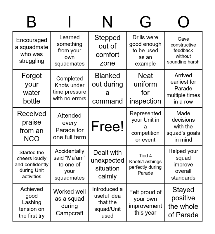 This bingo card has a free space and 24 words: Accidentally said “Ma’am" to one of your squadmates, Worked well as a squad during Campcraft, Blanked out during a command, Achieved good Lashing tension on the first try, Gave constructive feedback without sounding harsh, Encouraged a squadmate who was struggling, Forgot your water bottle, Learned something from your own squadmates, Represented your Unit in a competition or event, Dealt with unexpected situation calmly, Neat uniform for inspection, Received praise from an NCO, Tied 4 Knots/Lashings perfectly during Parade, Helped your squad improve overall standards, Completed Knots under time pressure with no errors, Felt proud of your own improvement this year, Made decisions with the squad’s goals in mind, Stepped out of comfort zone, Arrived earliest for Parade multiple times in a row, Attended every Parade for one full term, Stayed positive the whole of Parade, Started the cheers loudly and confidently during Unit activities, Drills were good enough to be used as an example and Introduced a useful idea that the squad/Unit used.