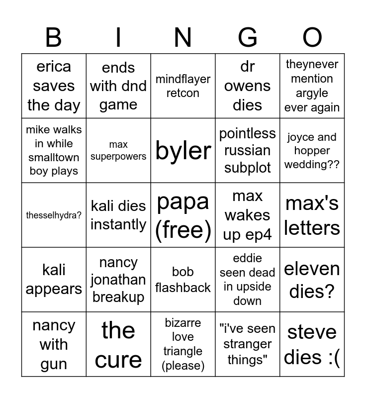 This bingo card has a free space and 24 words: nancy jonathan breakup, the cure, byler, nancy with gun, theynever mention argyle ever again, erica saves the day, mike walks in while smalltown boy plays, ends with dnd game, max wakes up ep4, bob flashback, pointless russian subplot, thesselhydra?, eddie seen dead in upside down, eleven dies?, max superpowers, "i've seen stranger things", max's letters, mindflayer retcon, joyce and hopper wedding??, kali dies instantly, steve dies :(, kali appears, dr owens dies and bizarre love triangle (please).
