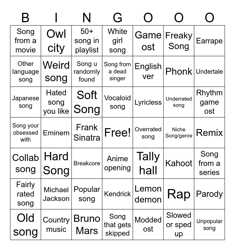 This bingo card has a free space and 48 words: Lemon demon, Phonk, Song that gets skipped, Eminem, Soft Song, Remix, Owl city, Country music, Freaky Song, Anime opening, Earrape, White girl song, Underrated song, Lyricless, Fairly rated song, Niche Song/genre, Other language song, Undertale, Rap, Game ost, English ver, Frank Sinatra, Song from a movie, Weird song, Parody, Song u randomly found, Rhythm game ost, Old song, Vocaloid song, Hated song you like, Slowed or sped up, Overrated song, Song from a series, Michael Jackson, Song your obsessed with, Tally hall, Kahoot, Japanese song, Breakcore, Popular song, Collab song, Unpopular song, 50+ song in playlist, Bruno Mars, Song from a dead singer, Kendrick, Hard Song and Modded ost.