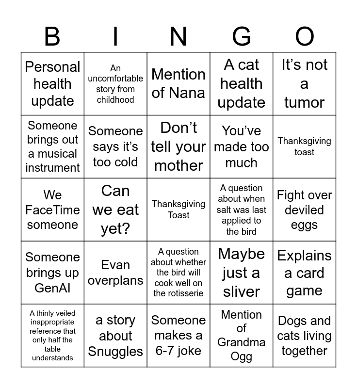 This bingo card has a free space and 43 words: Merry Christmas asshole, Dogs and cats living together, A story that the person telling it was not there for, A thinly veiled inappropriate reference that only half the table understands, A story in which no remembers which house it took place in, Mention of Grandma Ogg, Mention of Nana, Drinks before 1 pm, It’s not a tumor, a story about Snuggles, A cat health update, A question about when salt was last applied to the bird, A question about whether the bird will cook well on the rotisserie, Evan overplans, Cranberry orange relish debate, Someone makes a 6-7 joke, Someone explains the 6-7 joke, We FaceTime someone, Someone gets teary, Thanksgiving toast, An uncomfortable story from childhood, Ted Lasso, A description about the craft, Personal health update, Diesel fitter, Fight over deviled eggs, Chaotic family picture, Picking at the salt for the turkey, Maybe just a sliver, Someone brings up GenAI, Something is forgotten to be put in the oven, Explains a card game, Someone doesn’t have nickels, Can we eat yet?, Beehive update, Someone breaks into song, Pair of - Riff playing garbage, Don’t tell your mother, Someone brings out a musical instrument, You’ve made too much, Whining. About something., Someone says it’s too cold and A question about how much the turkey weighs.