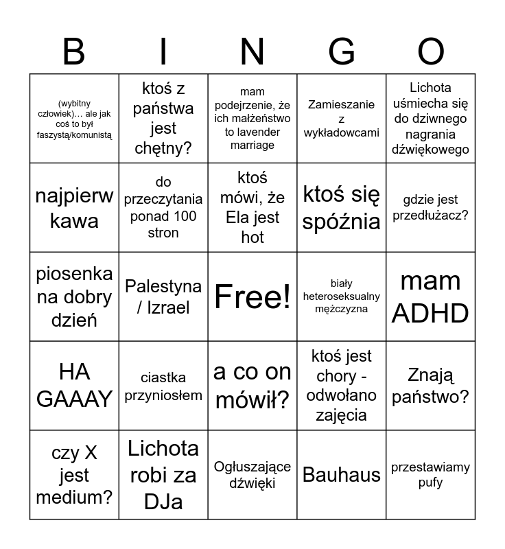This bingo card has a free space and 33 words: pornograficzny, performative male behaviour, Palestyna / Izrael, Alejski siada na ławce, HA GAAAY, do przeczytania ponad 100 stron, Lichota uśmiecha się do dziwnego nagrania dźwiękowego, czy X jest medium?, ktoś z państwa jest chętny?, podobało wam się? (Prowokatywnie), ktoś mówi, że Ela jest hot, mam podejrzenie, że ich małżeństwo to lavender marriage, Lichota wali ciąg ciekawostek niezwiązanych z przedmiotem, ENGLISH PLEASEEEE, biały heteroseksualny mężczyzna, gdzie jest przedłużacz?, Lichota robi za DJa, piosenka na dobry dzień, ciastka przyniosłem, ktoś jest chory - odwołano zajęcia, a co on mówił?, Krawczak trzyma coś w ręce byle trzymać. Kupmy mu fidget spinnera, (wybitny człowiek)… ale jak coś to był faszystą/komunistą, mam ADHD, Ogłuszające dźwięki, przestawiamy pufy, Zamieszanie z wykładowcami, ktoś się spóźnia, najpierw kawa, Znają państwo?, Projekt manhattan, Bauhaus and paypal mafia.