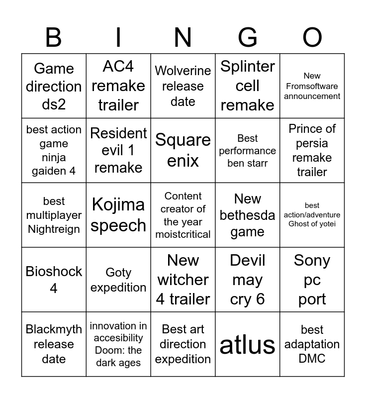 This bingo card has 25 words: Goty expedition, Best art direction expedition, Square enix, Blackmyth release date, New Fromsoftware announcement, Game direction ds2, best action game ninja gaiden 4, AC4 remake trailer, New bethesda game, New witcher 4 trailer, Best performance ben starr, best multiplayer Nightreign, Devil may cry 6, Sony pc port, Resident evil 1 remake, best adaptation DMC, best action/adventure Ghost of yotei, Wolverine release date, Prince of persia remake trailer, Kojima speech, Content creator of the year moistcritical, innovation in accesibility Doom: the dark ages, Bioshock 4, Splinter cell remake and atlus.