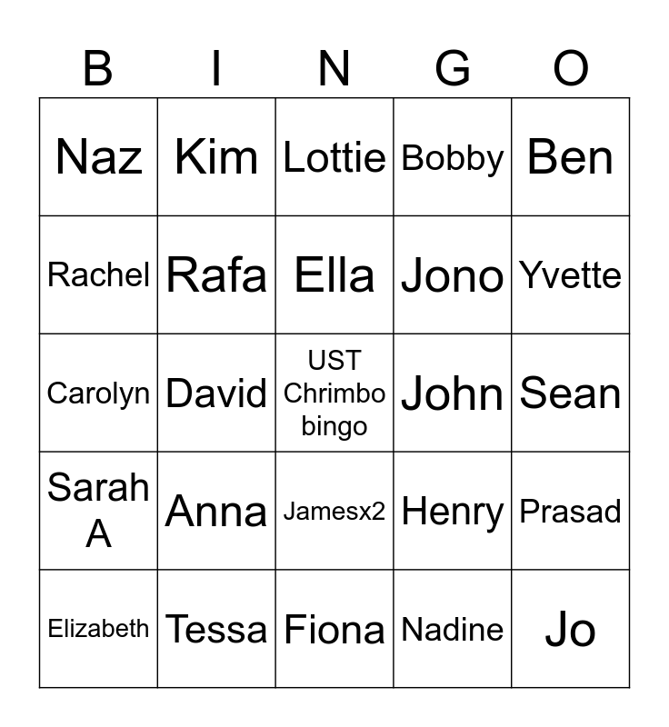 This bingo card has a free space and 33 words: Angus, Madalina, David, Helene, Sarah A, Rafa, Ben, Elizabeth, Kim, Inigo, Ella, Lottie, Lily, Jesse, John, Yvette, Tessa, Carolyn, Anna, Henry, Jamesx2, Electra, Naz, Sean, Fiona, Jo, Bobby, Jono, Rachel, Prasad, Manfredi, Nadine and Doug.