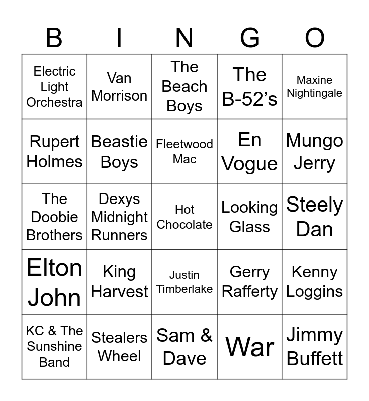 This bingo card has 41 words: Barry Manilow, The Doobie Brothers, Captain & Tennille, Beastie Boys, Stealers Wheel, Justin Timberlake, Fleetwood Mac, Wild Cherry, Maxine Nightingale, Elton John, Dexys Midnight Runners, The B-52’s, Hot Chocolate, Steely Dan, Looking Glass, King Harvest, The Four Seasons, Electric Light Orchestra, Norman Greenbaum, The Beach Boys, Kenny Loggins, Jimmy Buffett, Sam & Dave, En Vogue, Tone-Loc, The Jacksons, War, Duran Duran, Mungo Jerry, Seals and Crofts, Bob Seger, Van Morrison, KC & The Sunshine Band, Stevie Wonder, Gerry Rafferty, Rupert Holmes, Supertramp, Tom Jones, Simple Minds, Yes and The Zombies.