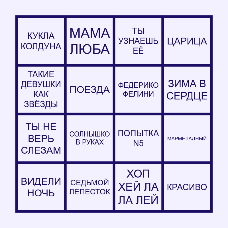 This bingo card has 50 words: БАТАРЕЙКА, ВИДЕЛИ НОЧЬ, КРАСИВАЯ ЖИЗНЬ, MACARENA, КАТЯ, ВОЗЬМИ ТЕЛЕФОН, ФАНТАЗЁР, МАМА ЛЮБА, ЗНАЕШЬ ЛИ ТЫ, ПОЕЗДА, ЮНОСТЬ, ФЕДЕРИКО ФЕЛИНИ, ЦАРИЦА, ЗИМА-ХОЛОДА, IT'S MY LIFE, НАС НЕ ДОГОНЯТ, НОЧЬ, ЗИМА В СЕРДЦЕ, СЕДЬМОЙ ЛЕПЕСТОК, КОЛАМБИЯ ПИКЧЕРЗ, ТАКИЕ ДЕВУШКИ КАК ЗВЁЗДЫ, МАРМЕЛАДНЫЙ, МУЗЫКА НАС СВЯЗАЛА, КУКЛА КОЛДУНА, ТЫ НЕ ВЕРЬ СЛЕЗАМ, СОЛНЦЕ МОНАКО, О НЁМ, СОЛНЫШКО В РУКАХ, ТОПОЛИНЫЙ ПУХ, ТЫ УЗНАЕШЬ ЕЁ, GANGNAM STYLE, НЕВОЗМОЖНОЕ ВОЗМОЖНО, DESPACITO, ВЫПЬЕМ ЗА ЛЮБОВЬ, САЛЮТ, ВЕРА, ШИРОКА РЕКА, ЕСЛИ ХОЧЕШЬ ТАНЦЕВАТЬ, ВИНОГРАД, ПОЛКОВНИК, ОСТАНУСЬ, ХОП ХЕЙ ЛА ЛА ЛЕЙ, ТЫ МЕНЯ НЕ ИЩИ, ЯСНЫЙ МОЙ СВЕТ, ПОСМОТРИ В ГЛАЗА, ЛОНДОН, ГУДБАЙ, ГРАНИТНЫЙ КАМУШЕК, ПОПЫТКА N5, ДЫМ СИГАРЕТ С МЕНТОЛОМ, БОЖЕ, КАКОЙ ПУСТЯК, КРАСИВО and ВЕТЕР С МОРЯ ДУЛ.