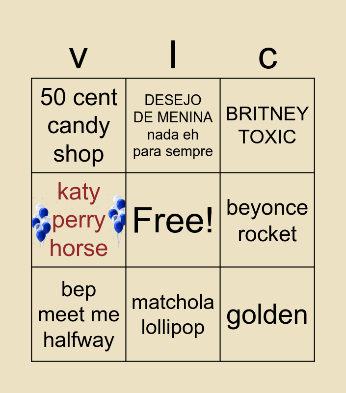 This bingo card has 1 images, a free space and 8 words: beyonce rocket, BRITNEY TOXIC, DESEJO DE MENINA nada eh para sempre, bep meet me halfway, 50 cent candy shop, golden, katy perry horse and matchola lollipop.