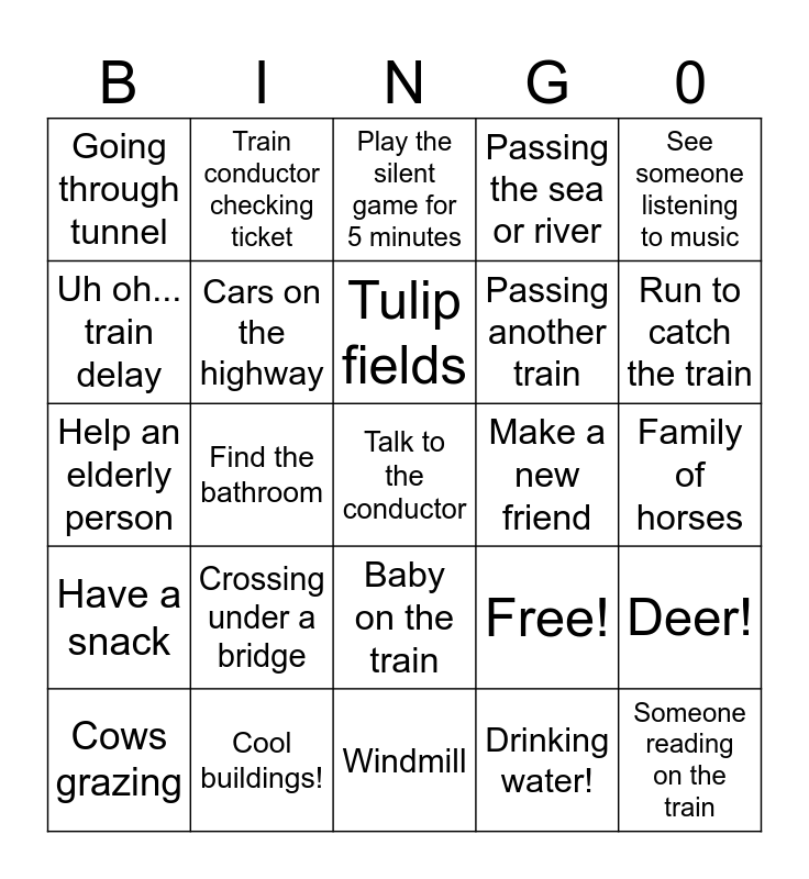 This bingo card has 25 words: Crossing under a bridge, Windmill, Tulip fields, Cows grazing, See someone listening to music, Going through tunnel, Uh oh... train delay, Train conductor checking ticket, Make a new friend, Baby on the train, Passing another train, Help an elderly person, Free!, Deer!, Cars on the highway, Someone reading on the train, Family of horses, Play the silent game for 5 minutes, Run to catch the train, Find the bathroom, Talk to the conductor, Cool buildings!, Have a snack, Passing the sea or river and Drinking water!.