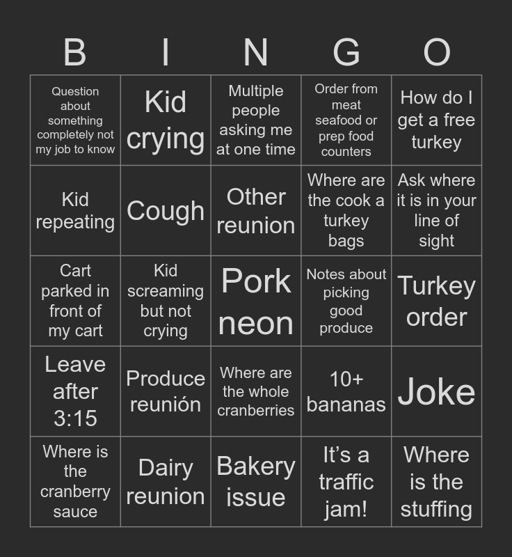 This bingo card has a free space and 24 words: Produce reunión, Dairy reunion, Other reunion, Where is the cranberry sauce, How do I get a free turkey, Question about something completely not my job to know, Kid repeating, Kid crying, Notes about picking good produce, Where are the whole cranberries, Where are the cook a turkey bags, Cart parked in front of my cart, 10+ bananas, Joke, Cough, It’s a traffic jam!, Turkey order, Multiple people asking me at one time, Ask where it is in your line of sight, Kid screaming but not crying, Where is the stuffing, Leave after 3:15, Order from meat seafood or prep food counters and Bakery issue.