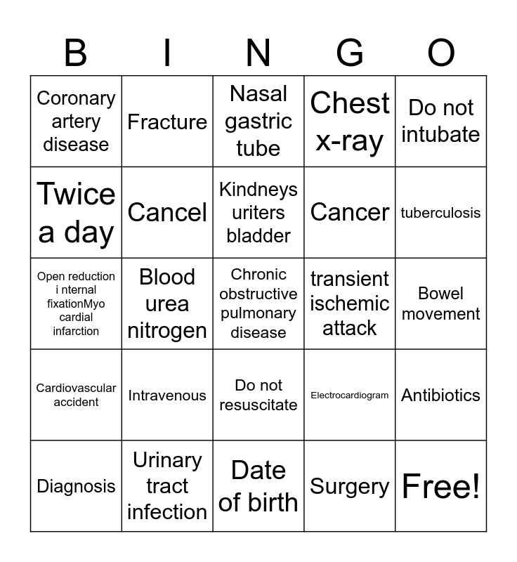 This bingo card has 33 words: Free!, Acute renal failure, Blood urea nitrogen, Complete blood count, Cardiovascular accident, Cancel, Do not intubate, Diagnosis, Fracture, Lower left quadrant, Kindneys uriters bladder, Nasal gastric tube, Short of breath, Type 2 diabetes, transient ischemic attack, tuberculosis, Urinary tract infection, Open reduction i nternal fixationMyo cardial infarction, Intravenous, Electrocardiogram, Do not resuscitate, Carbon dioxide, Coronary artery disease, Bowel movement, Date of birth, Chronic obstructive pulmonary disease, Chest x-ray, Cancer, Twice a day, Antibiotics, By mouth, Surgery and Upper respiratory infection.