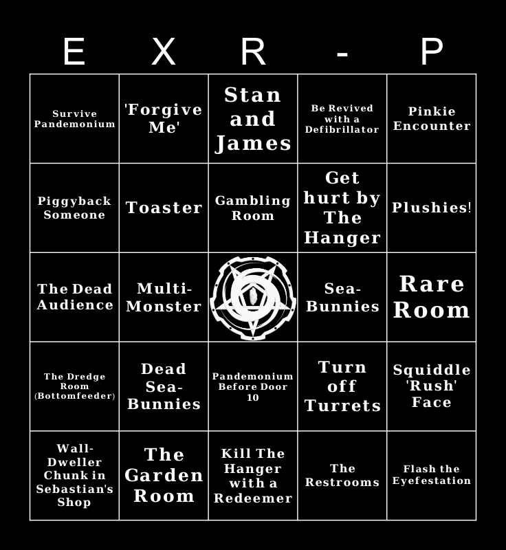 This bingo card has a free space and 39 words: 𝐌𝐚𝐧 𝐅𝐫𝐨𝐦 𝐓𝐡𝐞 𝐌𝐢𝐧𝐝𝐬𝐜𝐚𝐩𝐞 (𝐨𝐫 𝐒𝐭𝐲𝐱), 𝐒𝐨𝐦𝐞𝐨𝐧𝐞 𝐃𝐢𝐞𝐬 𝐁𝐞𝐟𝐨𝐫𝐞 𝐃𝐨𝐨𝐫 𝟓𝟎, 𝐖𝐚𝐥𝐥-𝐃𝐰𝐞𝐥𝐥𝐞𝐫 𝐑𝐮𝐧𝐬 𝐀𝐰𝐚𝐲, 𝐓𝐨𝐚𝐬𝐭𝐞𝐫, 𝐖𝐚𝐥𝐥-𝐃𝐰𝐞𝐥𝐥𝐞𝐫 𝐂𝐡𝐮𝐧𝐤 𝐢𝐧 𝐒𝐞𝐛𝐚𝐬𝐭𝐢𝐚𝐧'𝐬 𝐒𝐡𝐨𝐩, 𝐏𝐚𝐧𝐝𝐞𝐦𝐨𝐧𝐢𝐮𝐦 𝐁𝐞𝐟𝐨𝐫𝐞 𝐃𝐨𝐨𝐫 𝟏𝟎, 𝐆𝐚𝐦𝐛𝐥𝐢𝐧𝐠 𝐑𝐨𝐨𝐦, 𝐓𝐡𝐞 𝐍𝐞𝐜𝐫𝐨𝐛𝐥𝐨𝐱𝐢𝐜𝐨𝐧, 𝐏𝐢𝐧𝐤𝐢𝐞 𝐄𝐧𝐜𝐨𝐮𝐧𝐭𝐞𝐫, 𝐓𝐡𝐞 𝐃𝐫𝐞𝐝𝐠𝐞 𝐑𝐨𝐨𝐦 (𝐁𝐨𝐭𝐭𝐨𝐦𝐟𝐞𝐞𝐝𝐞𝐫), 𝐌𝐮𝐥𝐭𝐢-𝐌𝐨𝐧𝐬𝐭𝐞𝐫, 𝐁𝐞 𝐑𝐞𝐯𝐢𝐯𝐞𝐝 𝐰𝐢𝐭𝐡 𝐚 𝐃𝐞𝐟𝐢𝐛𝐫𝐢𝐥𝐥𝐚𝐭𝐨𝐫, 𝐅𝐥𝐚𝐬𝐡 𝐭𝐡𝐞 𝐄𝐲𝐞𝐟𝐞𝐬𝐭𝐚𝐭𝐢𝐨𝐧, 𝐑𝐚𝐫𝐞 𝐑𝐨𝐨𝐦, 𝐒𝐞𝐚-𝐁𝐮𝐧𝐧𝐢𝐞𝐬, 𝐃𝐞𝐚𝐝 𝐒𝐞𝐚-𝐁𝐮𝐧𝐧𝐢𝐞𝐬, 𝐀𝐫𝐭𝐢𝐟𝐢𝐜𝐞 𝐂𝐡𝐞𝐬𝐭, 𝐒𝐮𝐫𝐯𝐢𝐯𝐞 𝐏𝐚𝐧𝐝𝐞𝐦𝐨𝐧𝐢𝐮𝐦, 𝐁𝐥𝐮𝐞 𝐨𝐫 𝐑𝐞𝐝 𝐈𝐦𝐚𝐠𝐢𝐧𝐚𝐫𝐲 𝐅𝐫𝐢𝐞𝐧𝐝, 𝐓𝐮𝐫𝐧 𝐨𝐟𝐟 𝐓𝐮𝐫𝐫𝐞𝐭𝐬, 𝐏𝐢𝐠𝐠𝐲𝐛𝐚𝐜𝐤 𝐒𝐨𝐦𝐞𝐨𝐧𝐞, 𝐊𝐢𝐥𝐥 𝐓𝐡𝐞 𝐇𝐚𝐧𝐠𝐞𝐫 𝐰𝐢𝐭𝐡 𝐚 𝐑𝐞𝐝𝐞𝐞𝐦𝐞𝐫, 𝐆𝐞𝐭 𝐡𝐮𝐫𝐭 𝐛𝐲 𝐓𝐡𝐞 𝐇𝐚𝐧𝐠𝐞𝐫, 𝐏𝐥𝐮𝐬𝐡𝐢𝐞𝐬!, 𝐅𝐢𝐱 𝟓 𝐆𝐞𝐧𝐞𝐫𝐚𝐭𝐨𝐫𝐬, 𝐄𝐧𝐜𝐨𝐮𝐧𝐭𝐞𝐫 𝐏𝐢𝐭𝐬/𝐇𝐨𝐥𝐞𝐬, 𝐄𝐧𝐜𝐨𝐮𝐧𝐭𝐞𝐫 𝐋𝐚𝐯𝐚 𝐏𝐨𝐨𝐥𝐬, 𝐀𝐧𝐭𝐢-𝐏𝐞𝐫𝐬𝐨𝐧𝐧𝐞𝐥 𝐋𝐚𝐧𝐝𝐦𝐢𝐧𝐞𝐬, 𝐏𝐢𝐬𝐬 𝐎𝐟𝐟 𝐒𝐞𝐛𝐚𝐬𝐭𝐢𝐚𝐧, '𝐅𝐨𝐫𝐠𝐢𝐯𝐞 𝐌𝐞', '𝐈 𝐣𝐮𝐬𝐭 𝐰𝐚𝐧𝐭 𝐭𝐨 𝐩𝐚𝐢𝐧𝐭 𝐥𝐚𝐧𝐝𝐬𝐜𝐚𝐩𝐞𝐬 𝐚𝐠𝐚𝐢𝐧', 𝐏𝐮𝐫𝐩𝐥𝐞 𝐀𝐛𝐬𝐭𝐫𝐚𝐜𝐭 𝐀𝐫𝐭, 𝐒𝐭𝐚𝐧 𝐚𝐧𝐝 𝐉𝐚𝐦𝐞𝐬, 𝐓𝐡𝐞 𝐆𝐚𝐫𝐝𝐞𝐧 𝐑𝐨𝐨𝐦, 𝐓𝐡𝐞 𝐑𝐞𝐬𝐭𝐫𝐨𝐨𝐦𝐬, 𝐁𝐥𝐚𝐜𝐤𝐬𝐢𝐭𝐞 𝐀𝐝𝐦𝐢𝐧𝐢𝐬𝐭𝐫𝐚𝐭𝐢𝐨𝐧, 𝐒𝐪𝐮𝐢𝐝𝐝𝐥𝐞 '𝐑𝐮𝐬𝐡' 𝐅𝐚𝐜𝐞, 𝐓𝐡𝐞 𝐃𝐞𝐚𝐝 𝐀𝐮𝐝𝐢𝐞𝐧𝐜𝐞 and 𝐏𝐮𝐧𝐜𝐡 𝐁𝐚𝐛𝐲 𝟓𝟎𝟎 𝐓𝐢𝐦𝐞𝐬.