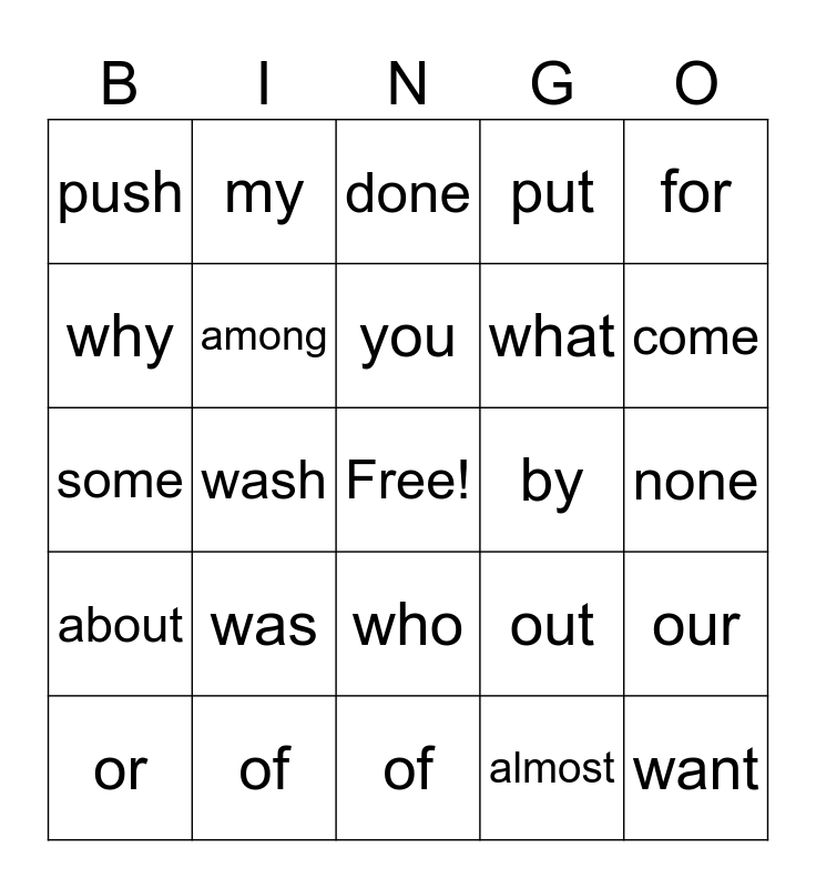 This bingo card has a free space and 24 words: was, of, you, or, for, push, why, my, by, who, what, some, out, our, among, almost, none, done, come, wash, want, about, put and of.