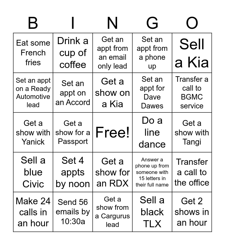This bingo card has a free space and 24 words: Make 24 calls in an hour, Set 4 appts by noon, Get a show on a Kia, Sell a black TLX, Sell a Kia, Eat some French fries, Drink a cup of coffee, Get an appt from an email only lead, Do a line dance, Get a show with Tangi, Get a show with Yanick, Set an appt on an Accord, Answer a phone up from someone with 15 letters in their full name, Transfer a call to the office, Set an appt on a Ready Automotive lead, Send 56 emails by 10:30a, Get a show from a Cargurus lead, Set an appt from a phone up, Transfer a call to BGMC service, Sell a blue Civic, Get a show for a Passport, Get a show for an RDX, Set an appt for Dave Dawes and Get 2 shows in an hour.