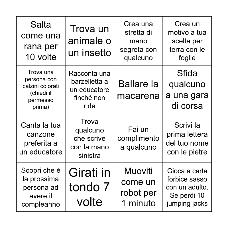 This bingo card has 16 words: Girati in tondo 7 volte, Scrivi la prima lettera del tuo nome con le pietre, Crea una stretta di mano segreta con qualcuno, Salta come una rana per 10 volte, Canta la tua canzone preferita a un educatore, Trova un animale o un insetto, Fai un complimento a qualcuno, Muoviti come un robot per 1 minuto, Trova una persona con calzini colorati (chiedi il permesso prima), Racconta una barzelletta a un educatore finché non ride, Scopri che è la prossima persona ad avere il compleanno, Crea un motivo a tua scelta per terra con le foglie, Trova qualcuno che scrive con la mano sinistra, Sfida qualcuno a una gara di corsa, Ballare la macarena and Gioca a carta forbice sasso con un adulto. Se perdi 10 jumping jacks.