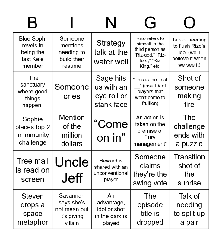 This bingo card has a free space and 24 words: Uncle Jeff, Savannah says she’s not mean but it’s giving villain, Sage hits us with an eye roll or stank face, Steven drops a space metaphor, Talk of needing to flush Rizo’s idol (we’ll believe it when we see it), Blue Sophi revels in being the last Kele member, “The sanctuary where good things happen”, Someone mentions needing to build their resume, An action is taken on the premise of “jury management”, Reward is shared with an unconventional player, “This is the final __” (insert # of players that won’t come to fruition), Sophie places top 2 in immunity challenge, Someone claims they’re the swing vote, Transition shot of the sunrise, Someone cries, The episode title is dropped, The challenge ends with a puzzle, Strategy talk at the water well, Shot of someone making fire, Mention of the million dollars, Talk of needing to split up a pair, Tree mail is read on screen, Rizo refers to himself in the third person as “Riz-god,” “Riz-lord,” “Riz King,” etc. and An advantage, idol or shot in the dark is played.
