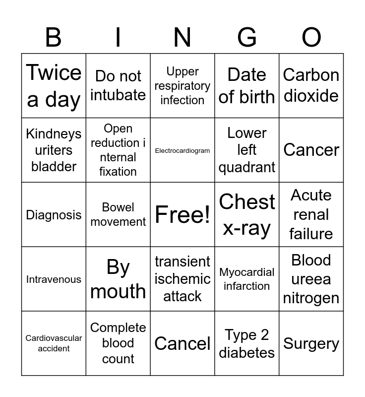 This bingo card has a free space and 36 words: transient ischemic attack, tuberculosis, Urinary tract infection, Open reduction i nternal fixation, Myocardial infarction, Intravenous, Electrocardiogram, Do not resuscitate, Carbon dioxide, Coronary artery disease, Bowel movement, Date of birth, Chronic obstructive pulmonary disease, Chest x-ray, Cancer, Twice a day, Antibiotics, By mouth, Surgery, Upper respiratory infection, Acute renal failure, Blood ureea nitrogen, Complete blood count, Cardiovascular accident, Cancel, Do not intubate, Diagnosis, Fracture, Lower left quadrant, Kindneys uriters bladder, Nasal gastric tube, Short of breath, Type 2 diabetes, transient ischemic attack, tuberculosis and Urinary tract infection.