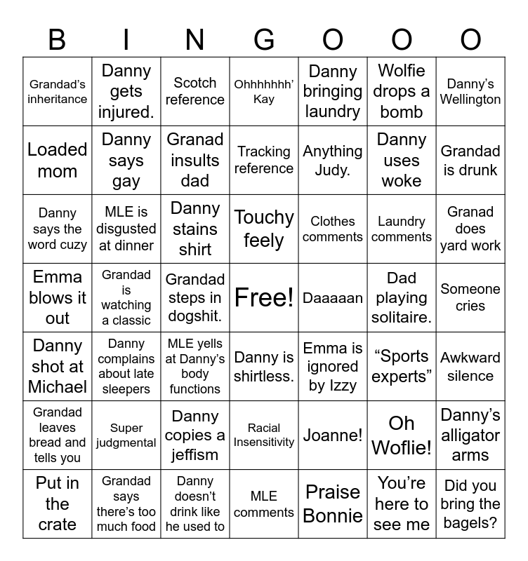 This bingo card has a free space and 48 words: Joanne!, Danny uses woke, MLE comments, Grandad is watching a classic, Danny stains shirt, Someone cries, Danny gets injured., Grandad says there’s too much food, Wolfie drops a bomb, Danny is shirtless., Danny’s Wellington, Ohhhhhhh’ Kay, Laundry comments, Clothes comments, Grandad leaves bread and tells you, Dad playing solitaire., Loaded mom, Grandad is drunk, Oh Woflie!, Danny bringing laundry, Anything Judy., Grandad steps in dogshit., Grandad’s inheritance, Danny says gay, Danny’s alligator arms, Granad insults dad, Granad does yard work, Put in the crate, Touchy feely, MLE is disgusted at dinner, You’re here to see me, Daaaaan, Awkward silence, Super judgmental, Emma blows it out, Emma is ignored by Izzy, “Sports experts”, Danny says the word cuzy, MLE yells at Danny’s body functions, Danny copies a jeffism, Danny shot at Michael, Did you bring the bagels?, Scotch reference, Danny doesn’t drink like he used to, Tracking reference, Racial Insensitivity, Danny complains about late sleepers and Praise Bonnie.