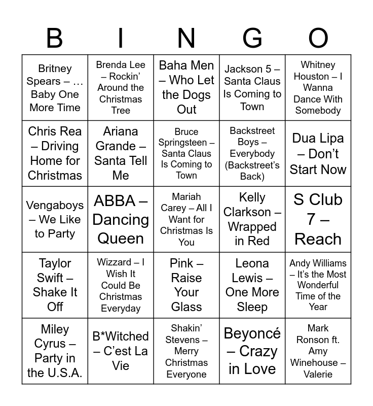 This bingo card has 46 words: Free!, Mariah Carey – All I Want for Christmas Is You, Wham! – Last Christmas, Shakin’ Stevens – Merry Christmas Everyone, Wizzard – I Wish It Could Be Christmas Everyday, Slade – Merry Xmas Everybody, Brenda Lee – Rockin’ Around the Christmas Tree, Bobby Helms – Jingle Bell Rock, Chris Rea – Driving Home for Christmas, Kelly Clarkson – Underneath the Tree, Ariana Grande – Santa Tell Me, Jackson 5 – Santa Claus Is Coming to Town, Andy Williams – It’s the Most Wonderful Time of the Year, Leona Lewis – One More Sleep, Mariah Carey – Christmas (Baby Please Come Home), Jonas Brothers – Like It’s Christmas, Bruce Springsteen – Santa Claus Is Coming to Town, Kelly Clarkson – Wrapped in Red, Michael Bublé – Holly Jolly Christmas, Whitney Houston – I Wanna Dance With Somebody, ABBA – Dancing Queen, Beyoncé – Crazy in Love, Britney Spears – …Baby One More Time, Backstreet Boys – Everybody (Backstreet’s Back), Spice Girls – Wannabe, Dua Lipa – Don’t Start Now, Miley Cyrus – Party in the U.S.A., Lady Gaga – Poker Face, Pink – Raise Your Glass, Taylor Swift – Shake It Off, Bon Jovi – Livin’ on a Prayer, Queen – Don’t Stop Me Now, Queen – I Want to Break Free, Journey – Don’t Stop Believin’, Cyndi Lauper – Girls Just Wanna Have Fun, B*Witched – C’est La Vie, S Club 7 – Reach, Steps – Tragedy, Village People – YMCA, DJ Casper – Cha Cha Slide, Mark Ronson ft. Amy Winehouse – Valerie, Baha Men – Who Let the Dogs Out, Vengaboys – We Like to Party, Vengaboys – Boom, Boom, Boom, Boom!!, Katrina & The Waves – Walking on Sunshine (stronger intro version) and Bryan Adams – Summer of ’69.
